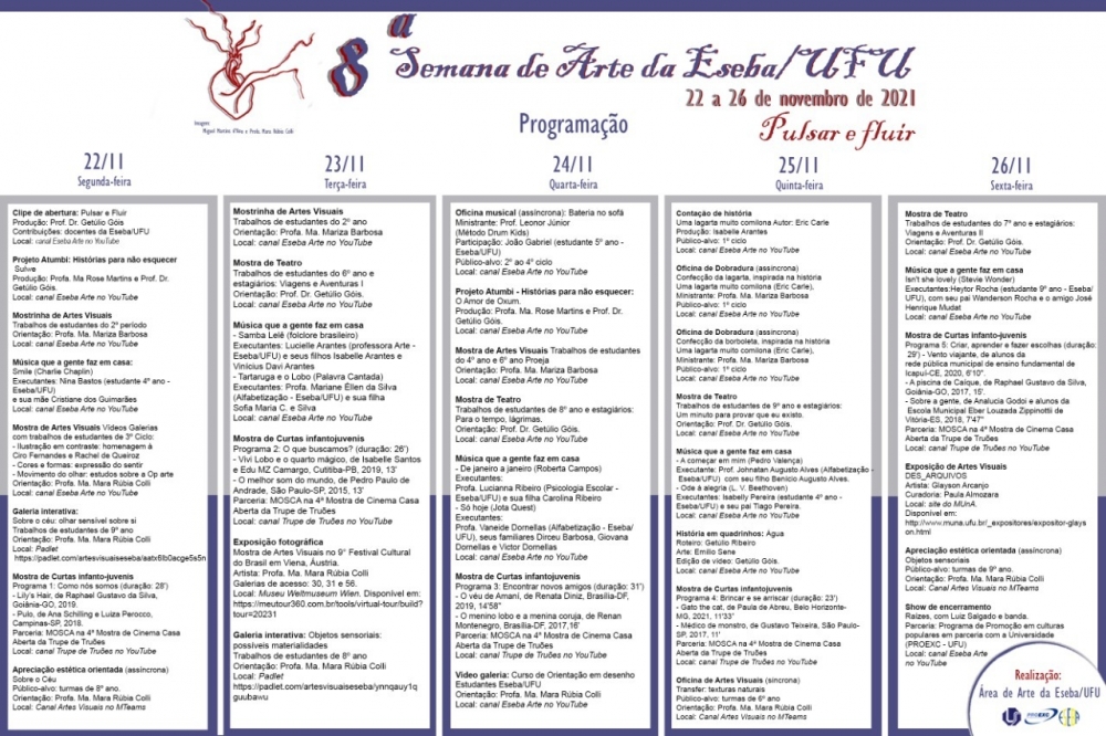 CONFIRA ABAIXO O CRONOGRAMA DA 8ª SEMANA DE ARTE DA ESEBA/UFU