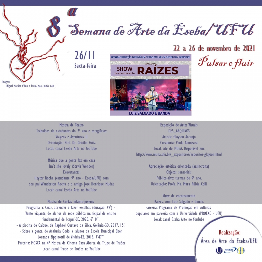 Aprecie o show de encerramento da 8ª Semana de Arte da Eseba: “Raízes”, com Luiz Salgado e banda, viabilizado pelo Programa de Promoção em culturas populares em parceria com a Universidade (PROEXC - UFU).