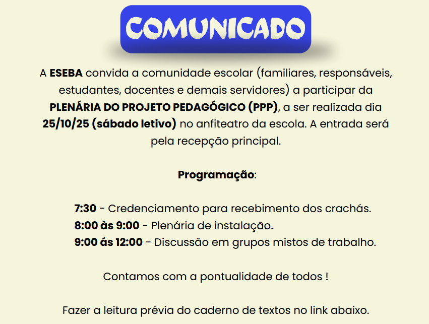 AconteceConvite para Plenárias do PPP - Sábado Letivo 25/10/2025 por WillianPublicado: 23/10/2025 - 10:52Última modificação: 23/10/2025 - 10:52 Compartilhe no FacebookTweet Widget Whatsapp Whatsapp Google Plus One https://eseba.ufu.br/acontece/2025-10-1deg-plenaria-do-ppp-2025