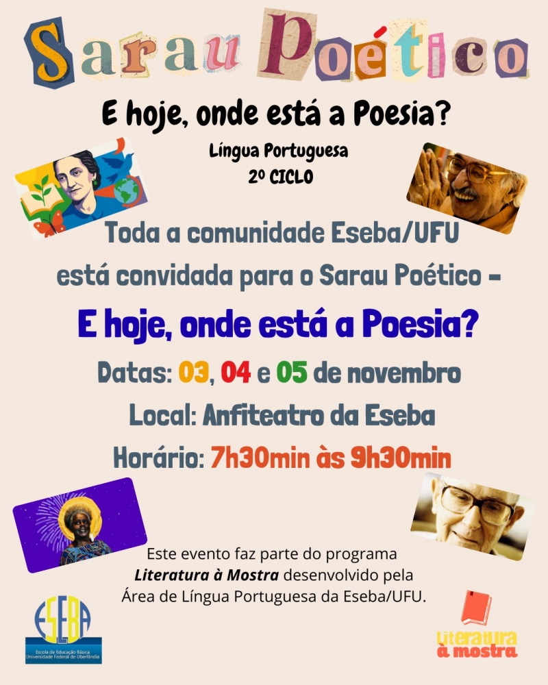 As docentes de Língua Portuguesa do 2º Ciclo convidam estudantes, famílias, docentes e servidores para participarem do Sarau Poético. Todos poderão experenciar o poder que há nas palavras declamando seu poema preferido. Será um momento singelo e espontâneo de declamação em que o contado com a palavra poética falada será o primordial.