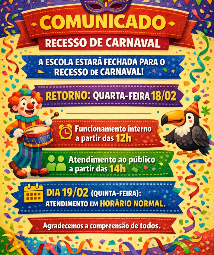 AconteceRecesso de Carnaval por WillianPublicado: 12/02/2026 - 14:57Última modificação: 12/02/2026 - 14:57 Compartilhe no FacebookTweet Widget Whatsapp Whatsapp Google Plus One