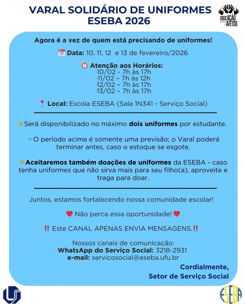 AconteceVaral Solidário de Uniformes ESEBA 2026 por WillianPublicado: 05/02/2026 - 09:12Última modificação: 05/02/2026 - 09:12 Compartilhe no FacebookTweet Widget Whatsapp Whatsapp Google Plus One