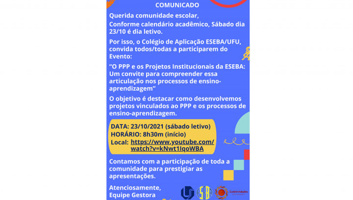 AconteceCOMUNICADO - SÁBADO LETIVO por AndreiaPublicado: 22/10/2021 - 14:28Última modificação: 22/10/2021 - 14:38 Compartilhe no FacebookTweet Widget Whatsapp Whatsapp Google Plus One Clique aqui para acessar a live “O PPP e os Projetos Institucionais da ESEBA: Um convite para compreender essa articulação nos processos de ensino-aprendizagem” AnexoTamanho comunicado_sabado_letivo_23-10-2021.pdf332.64 KB