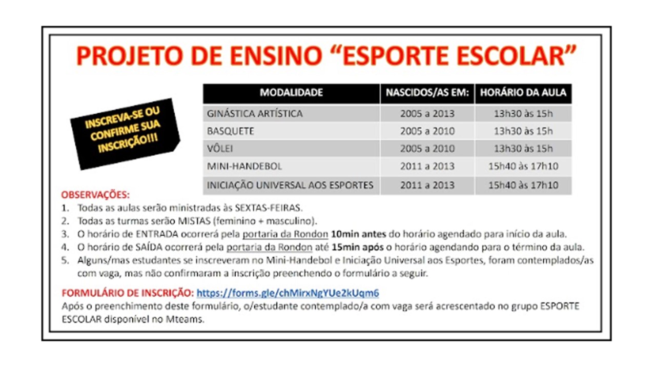 5. Alguns/mas estudantes se inscreveram no Mini-Handebol e Iniciação Universal aos Esportes, foram contemplados/as com vaga, mas não confirmaram a inscrição preenchendo o formulário a seguir.