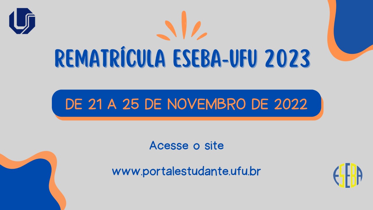 Iniciaremos, no dia 21 de novembro, a renovação de matrícula para o ano letivo de 2023. Informamos que o(a) responsável pelo(a) aluno(a) deverá realizar a rematrícula do(a) seu(a) filho(a), no período de 21 a 25 de novembro, através do portal do estudante (http://www.portalestudante.ufu.br).