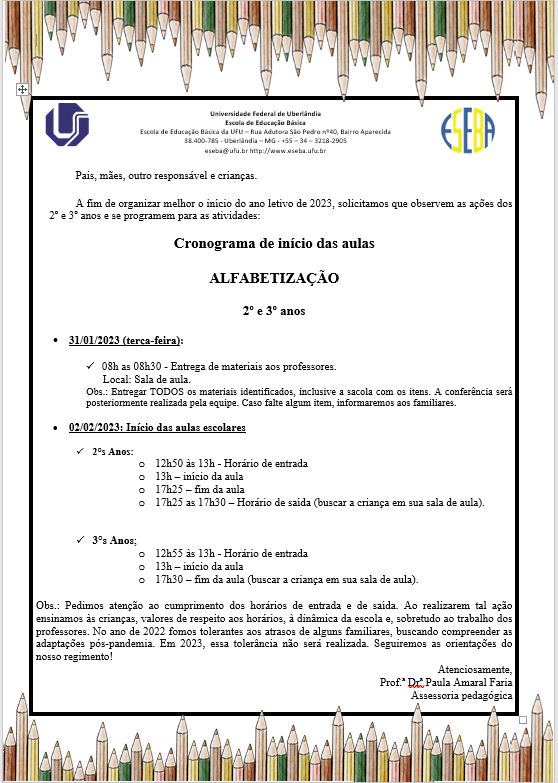 Cronograma de início das aulas- 2º e 3º anos 2023