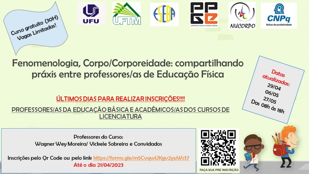 O curso intitulado "Fenomenologia, Corpo e Corporeidade: compartilhando práxis entre professores(as) de Educação Física" se amplia para todas as áreas da Educação, pois trata de uma temática que permeia todos os processos de ensino e aprendizagem. O curso terá certificação via UFU e faz parte de uma parceria entre UFU e UFTM a partir de um projeto de doutorado do Programa de Pós Graduação em Educação da UFTM e de um projeto de Bolsa Produtividade do CNPq.