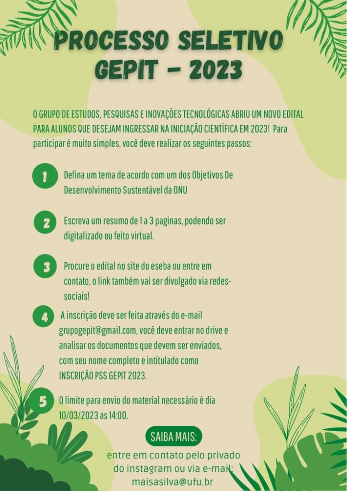 Clique no arquivo para visualizar a Lista de Apresentação para Seleção de Novos Integrantes – 2023 - GRUPO DE ESTUDOS, PESQUISAS E INOVAÇÕES TECNOLÓGICAS.